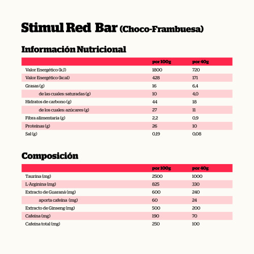 StimulRed Bar es una barrita energética a base de hidratos de carbono, con cafeína (100 mg/barrita), proteínas, aminoácidos como la taurina y L-Arginina, además de extractos naturales como el Ginseng y el Guaraná. Su composición es ideal para tomar como aporte energético y estimulante antes de la actividad física o para mantenerse activo durante la jornada diaria.