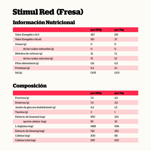 Ingredientes (sabor fresa): Agua, fructosa, dextrosa, jarabe de glucosa deshidratado, taurina, L-arginina L-aspartato, espesantes (carragenanos, goma xantana), extracto de guaraná (Paullinia cupana, semillas), acidulantes (ácido cítrico, ácido málico), extracto de ginseng (Panax ginseng C.A. Meyer, raíz), aromas, conservadores (sorbato potásico, benzoato sódico), cafeína, edulcorantes (acesulfamo potásico, sucralosa, glucósidos de esteviol procedentes de estevia).