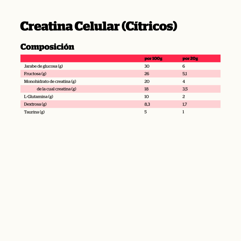 Ingredientes: Jarabe de glucosa deshidratado, fructosa, creatina monohidrato (Creapure®), LGlutamina, dextrosa, taurina, aroma, antiaglomerante (dióxido de silicio).